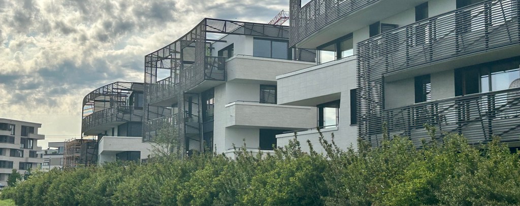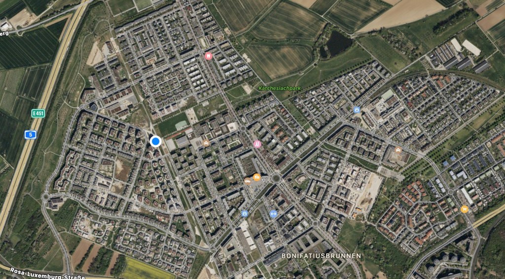 I’ll be honest, I’m not a huge fan of the architecture in Riedberg. It’s a perfect exhibition of modern residential monotony. Building after white, cubic building in straight geometric lines spaced out with tarmac paths and decent wide green strips and perfectly aligned trees. Take a look at the Google map and you’ll see how regimented the layout is. But if this doesn’t send you a little crazy, then you’ll proabably love it here!