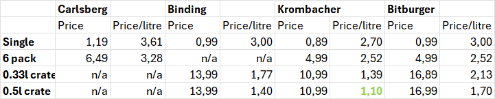 I have included Carlsberg, also as a reminder for myself how much extra I paid, for comparison. The real scam though is cost differential between buying a crate (normally 24 bottles) versus buying a 6 pack (wrapped in cardboard). I have included three popular types of local beer: Binding (from right here in Frankfurt), Krombacher (from Kreuztal, near Bonn) and Bitburger (from Bitburg near Luxembourg). You could also try Warsteiner or Jever, both common in shops here, but I’m not a fan :).